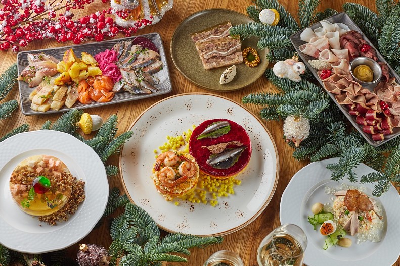 В праздничном меню от шефа – крудо из морского гребешка с цитрусовым соусом и паштет из утки с анчоусами, кокот с крабом и креветками и баклажаны пармиджано, новогоднее оливье с раковыми шейками и чёрной икрой и многое другое.