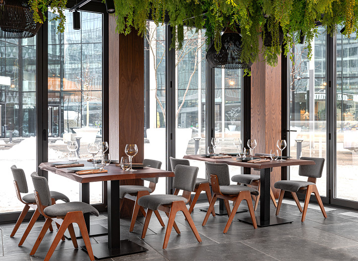 Новый проект, в интерьере которого за образец был взят стиль дорогих ресторанов Гонконга и Сингапура, занял отдельно стоящее стеклянное здание на площади у башен Neva Towers. Небольшое уютное пространство с панорамными окнами в пол, эффектными бамбуковыми абажурами, окутано изумрудной пеленой свешивающихся с потолка ампельных растений.