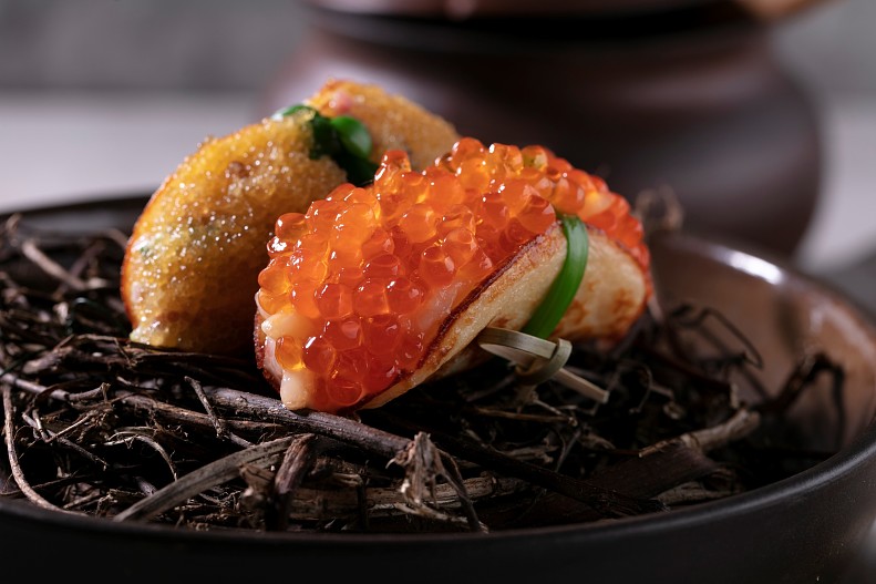 4. Для соуса: смешиваем сливки с рыбным соусом, добавляем кунжутное и зеленое масло и подогреваем в кастрюле до кипения. Остужаем соус до комнатной температуры, добавляем икру, аккуратно перемешиваем и поливаем готовым соусом блин на тарелке.