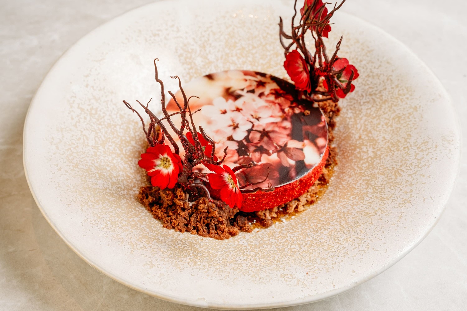 Далее сет продолжит подача тунца с легким овощным гарниром, жареным манго и томатами. Девушки особенно оценят подачу воздушного десерта с изображением нежно-розового цветка «Сакура» из сливочного пломбира с маракуйей, припущенной в портвейне пряной грушей и шоколадными веточками.
