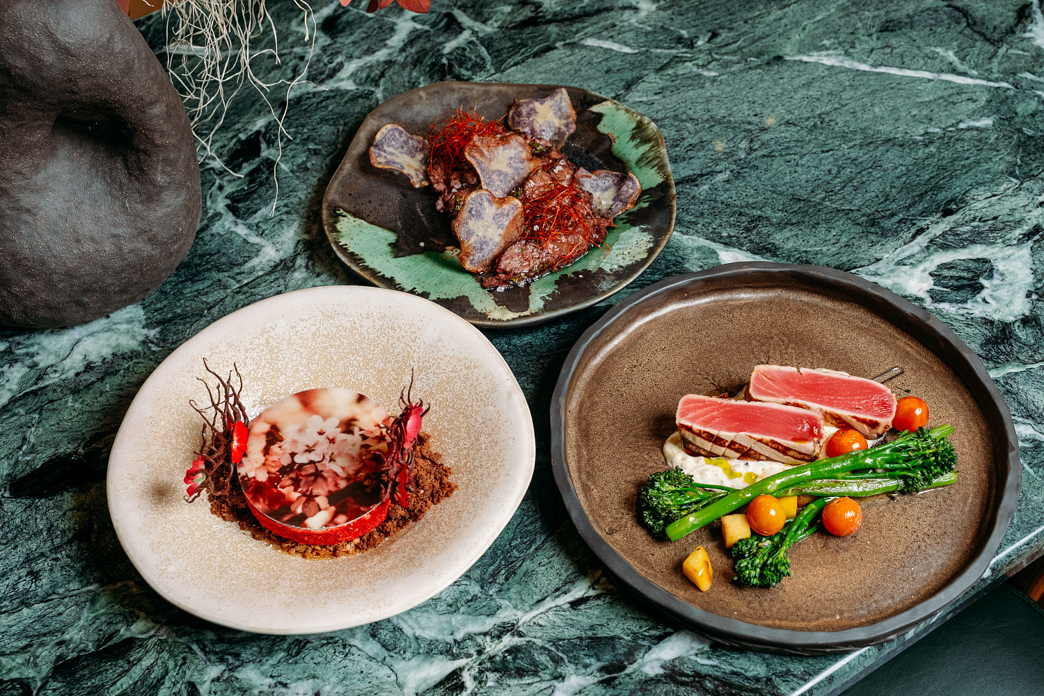 качестве стартера шеф-повар предлагает опалённую говядину с чипсами из фиолетового картофеля и нитями из перца чили, заправленную тайским соусом.