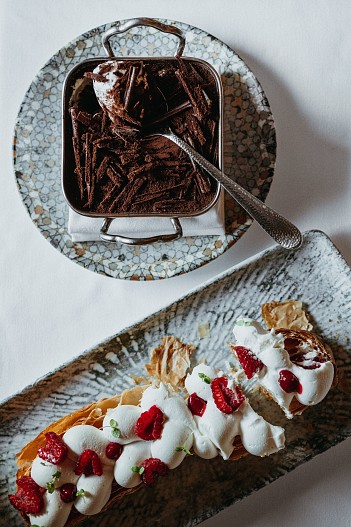 Булочка маритоццо , обычно начиненная взбитыми сливками, в авторской версии сервируется шоколадным, ванильным или фисташковым мороженым на выбор и украшается огоньком из шоколада. Бонет – традиционный пьемонтский десерт, известный с 13 века, который готовят в основном в холодное время года. Первоначальная рецептура не содержала шоколада, его добавили после открытия Америки, когда какао появилось в Европе. На пьемонтском диалекте слово «бонет» означает «шляпу», а «bonèt ëd cusin-a» (поварской колпак) – название медной формы в виде колпака, которая использовалась для приготовления. Кстати, приготовление бонета не терпит суеты: тесто из яиц, молока, печенья амаретти, какао и ликера Амаретто, запекается в жженой карамели 30 минут и настаивается 12 часов. Подается сладость по-настоящему роскошно: сусальное золото, мороженое из рикотты и жжёный фундук.