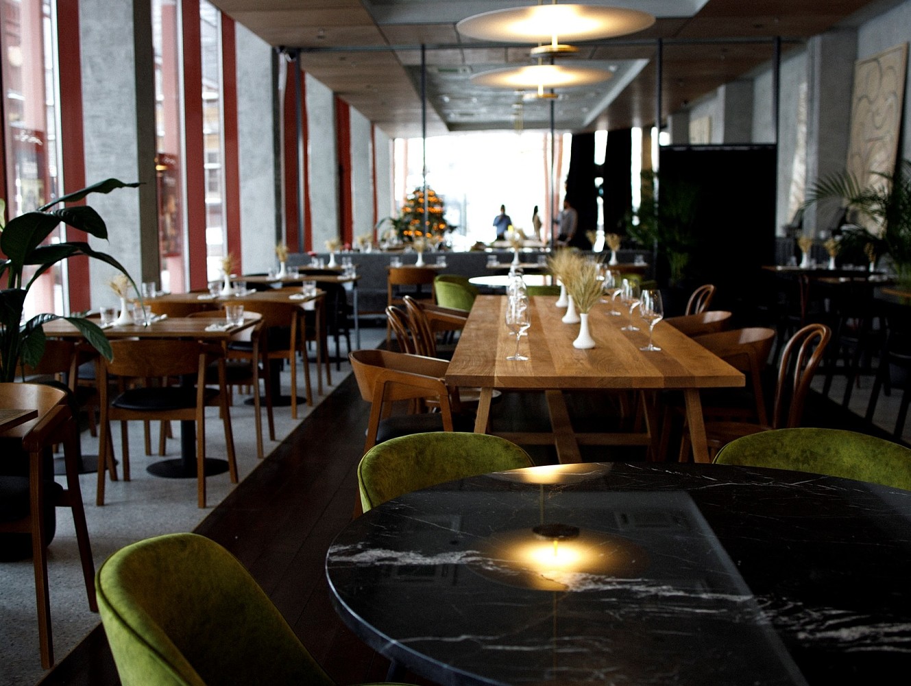 Интерьер нового ресторана был выбран в соответствии с общей концепцией. Большие стеклянные панорамные витрины, европейская скромность в интерьере, дерево, абстрактные картины и вкрапления насыщенного зелёного цвета растений и мягких кресел дают полное ощущение размеренности, спокойствия и создают тёплую и комфортную атмосферу, где хочется быть собой и наслаждаться общением с приятными людьми и вкусными блюдами.