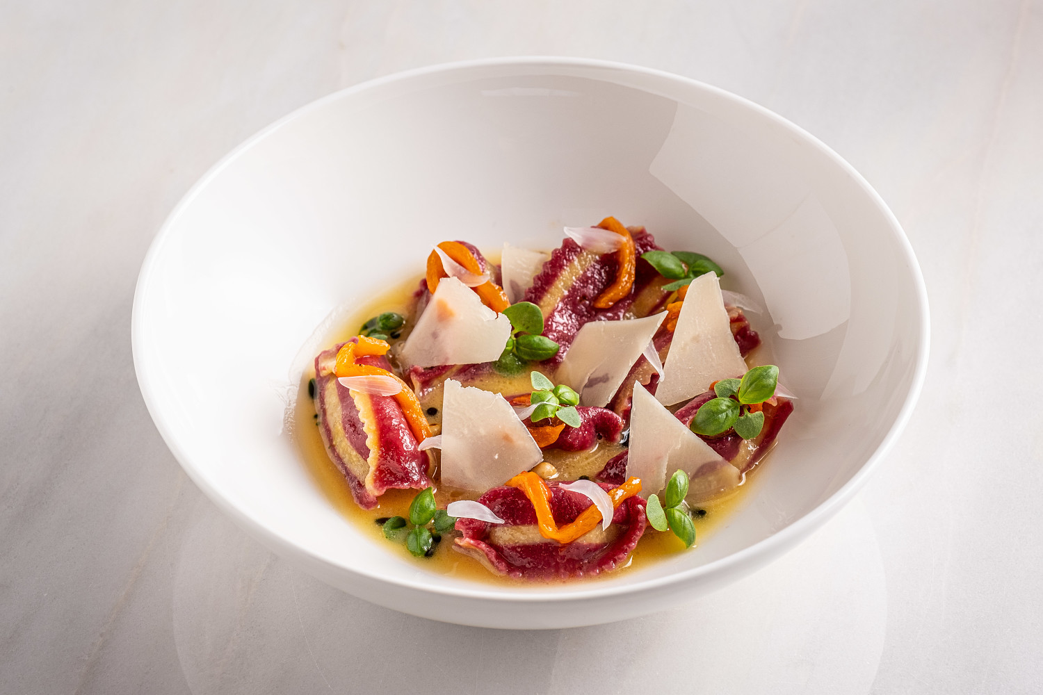 В каламаретти с крабом деликатесного мяса едва ли не больше, чем пасты; начинка из томленой шейки ягненка упакована в жизнерадостное полосатое тесто аньолотти, ведущее перекличку с графикой стен; ризотто, приготовленное на биске с креветками, или на крепком грибном бульоне с портобелло и белыми грибами спорит по уровню серотонина с десертами – в него добавляют мягкий сливочный сыр маскарпоне.