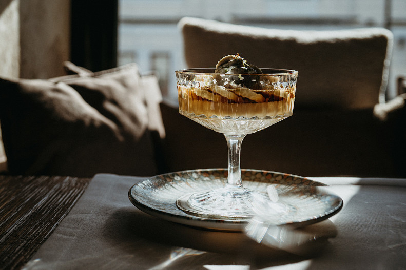 Валерия Сидорова – шеф-кондитер ресторана, не оставила сладкоежек без десерта и предлагает попробовать панна-котту из бананового молока с сиропом топинамбура (400 рублей) и сет из двух трюфелей из темного шоколада с розмарином и маракуйей (250 рублей). Обе сладости не содержат глютен и лактозу.