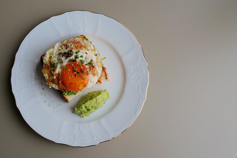 - Сэндвич на молочном хлебе с креветками кимчи, гуакамоле, огуречным салатом и глазуньей;