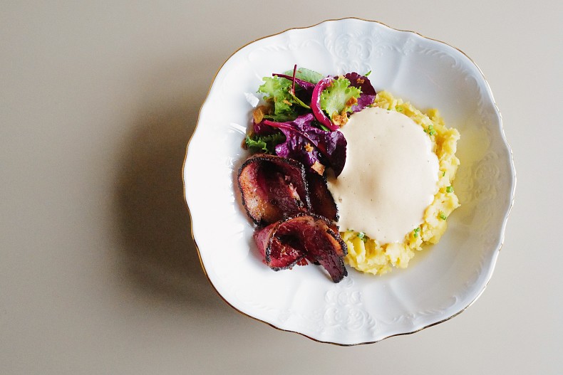 - Мятый картофель с пастрами, яйцом пашот и голландезом;