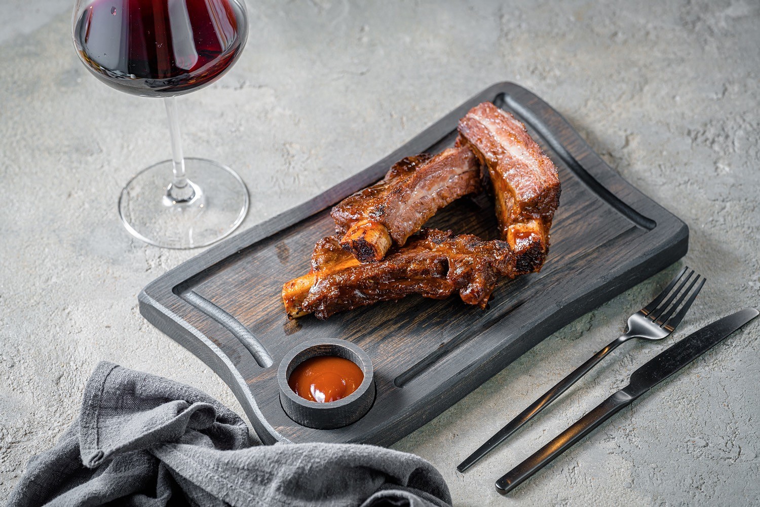 Говяжьи щечки предложат в паре с мощным и бархатистым Fervino Rouge — это купаж трех видов красного винограда. А после — фирменные томленые ребра, к ним выбраны два вина: Каберне Совиньон и Мерло. Последнее, кстати, вошло в Топ-100 лучших российских вин по версии Forbs, заслуженно получив очень высокую оценку профессионального жюри (94/100 балла).