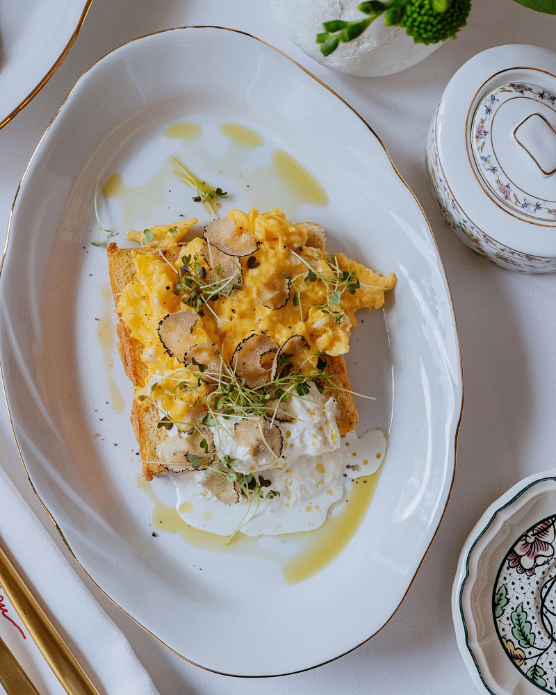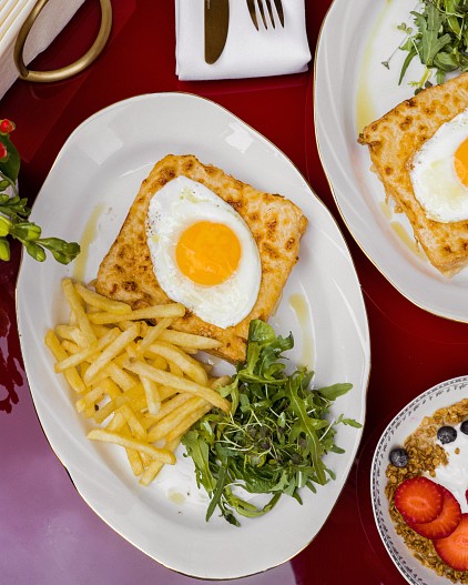 Так завтрак à la chic подают на мягкой бриоши со скрэмблом, страчателлой и порцией трюфеля (850), а яйца пашот со спаржей, голландезом и красной икрой (1900). Для любителей сладких историй готовят классические Crêpe suzette (750) и френч тосты a la parisienne (700).