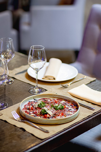 В меню представлены блюда на любой вкус: устрицы, ростбиф с хумусом и цветной капустой, сахалинский гребешок со спаржей, нежные телячьи щечки с трюфельной полентой, мраморная говядина с пюре из болгарского перца, клубничный суп, профитроли с заварным кремом в хрустальной полусфере.