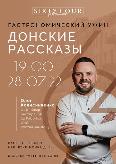 28 июля один из интереснейших шеф-поваров Юга России Олег Колисниченко «прочтёт» свои «Донские рассказы» в ресторане Sixty Four в Санкт-Петербурге.