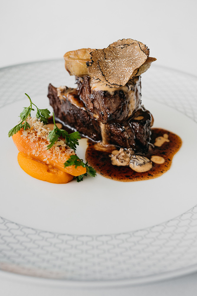 Из классических летних супов представлены щавелевый суп с яйцом по-домашнему (650 руб.), томатный гаспачо с крабом (1100 руб.) и окрошка на мацони с телячьим языком (550 руб.). В качестве основного курса можно взять запечённые улитки по-бургундски с перепелиными яйцами пашот (1300 руб.), большую фалангу краба со сладкими томатами конкассе (2500 руб.), насыщенную пасту папарделле с бурратой и спаржей (1450 руб.) или угольную треску, которая отлично гармонирует с ризотто с шафраном, морковью и креветками (1800 руб.). А поклонники провесной утки (1600 руб.) смогут оценить новую вариацию блюда: шеф оттенил птицу капустным гратеном, яблочным кремом и медовым соусом.
