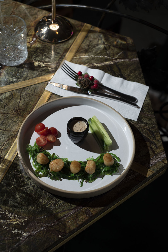1. 1. Гребешок с салатом из водорослей чукка и ореховым соусом.