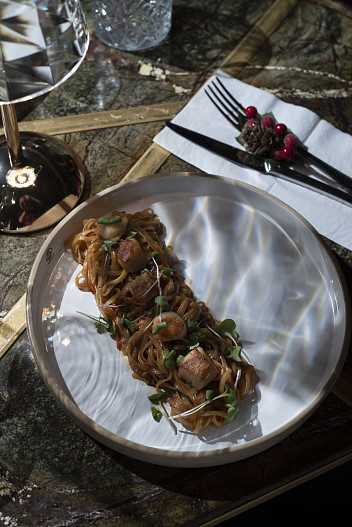 Блюдо подаётся с припущенными овощами и рисовой лапшой в азиатском стиле.