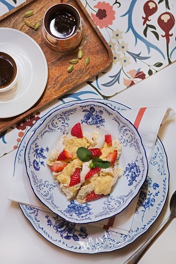 Начать день предлагают с грузинского завтрака. В утреннем меню — творожная запеканка, воздушный омлет с сулугуни – борано, мацони с фундуком и нежные сырники из надуги с абрикосовым вареньем. А еще всеобъемлющий и кинематографичный большой грузинский завтрак из 15 блюд с космополитичным шампанским. Впрочем, игристое подают к любому завтраку. Это очень по-грузински! Особое внимание стоит обратить на три вида кофе, который варят на песке — им можно не только взбодриться, но и увидеть судьбу в кофейной гуще.