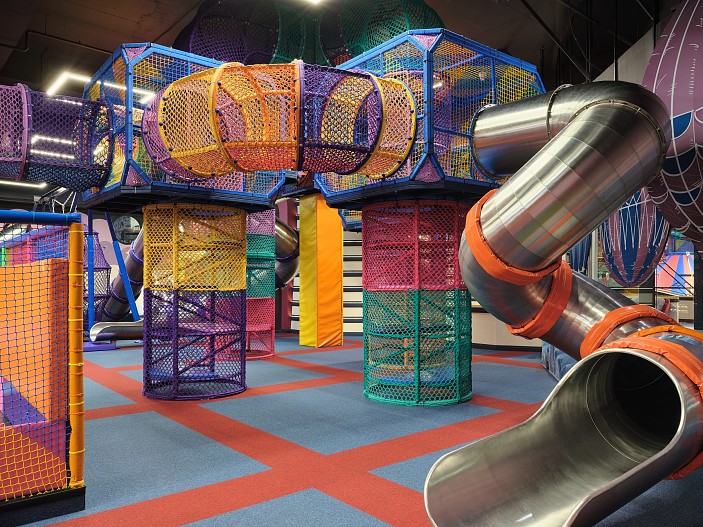 Настоящий парк развлечений с игровыми автоматами, аттракционами, тематическими зонами, батутами, планетарием и мастерской талантов. Для отдыха взрослой аудитории предусмотрен элегантный зал ресторана на 170 посадочных мест с видом на Неву, караоке залом, профессиональной сценой и комнатой с большой коллекцией крепкого алкоголя.