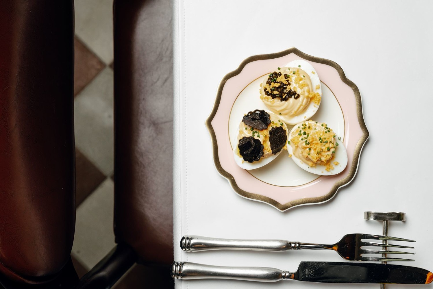 Все меню разбито на несколько разделов, где первый отдан небольшим закускам под тихие и игристые вина под названием Petites Assiettes – «Маленькие тарелочки». Он начинается с «Яйца Мимоза» (классическое яйцо с майонезом), которое предлагается в ресторане в трех видах – буржуа, аристократы и роял. С крабом, с трюфелем и с черной икрой соответственно. Здесь также можно найти террин из фуа-гра с чатни из айвы, эклер с крабом и цитрусовым майонезом и «Пате Пари-Москва», сделанный как перифраз знаменитого десерта «Пари-Брест» – на основе булочки из слоеного теста, но с куриным паштетом вместо сладкой начинки.