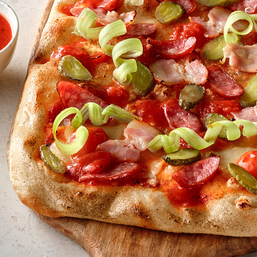 Пицца «Настроение: побыть одному». В составе — охотничьи колбаски, бекон, томаты черри, маринованные огурцы, моцарелла, сельдерей, соус «Кровавая Мэри» с водкой, томатом и табаско.