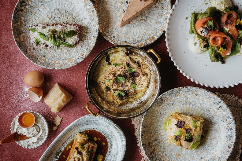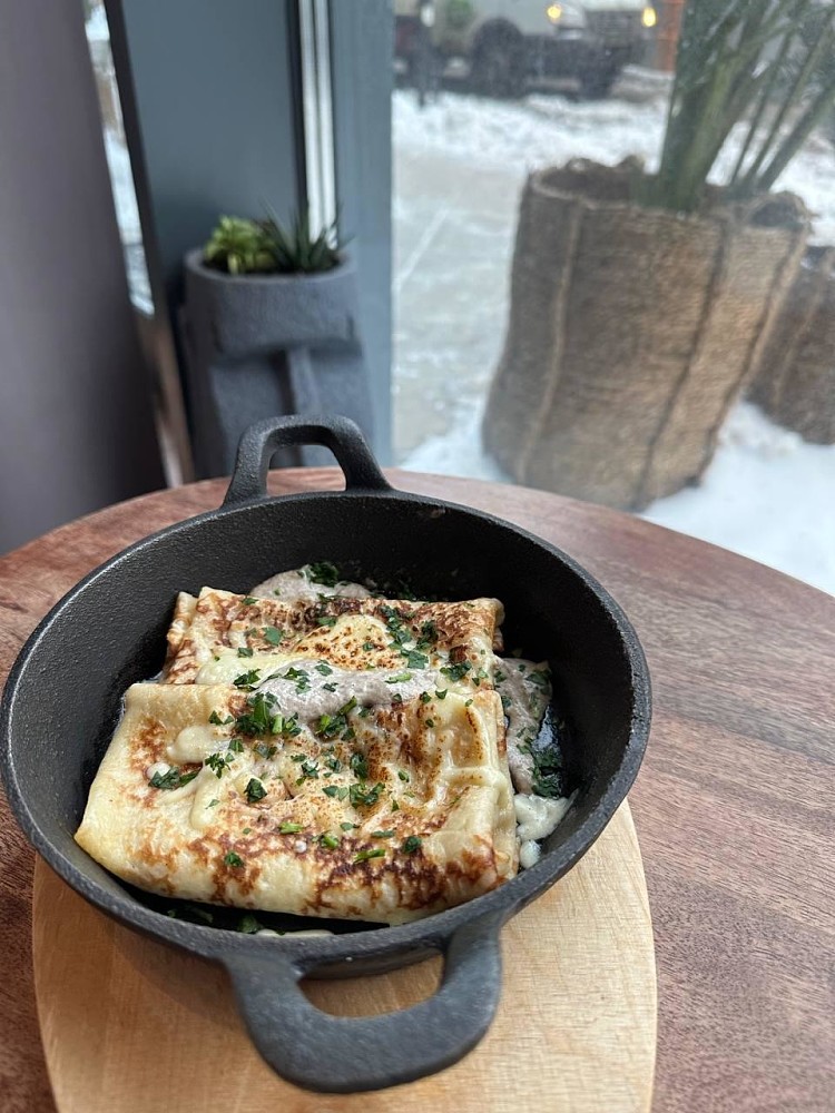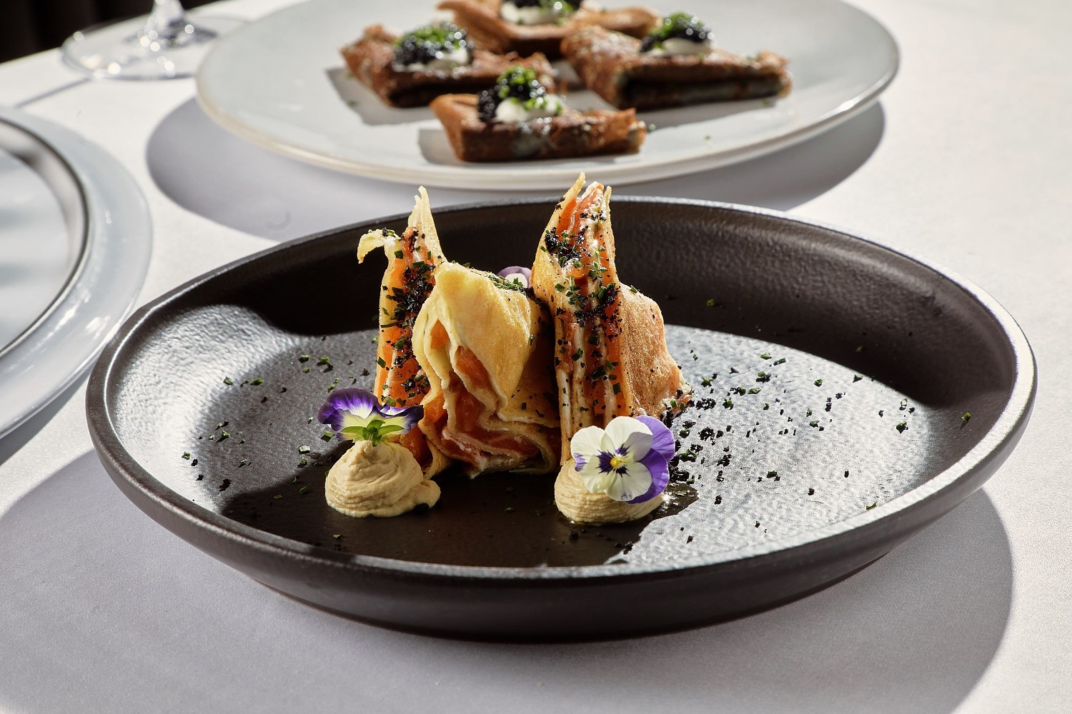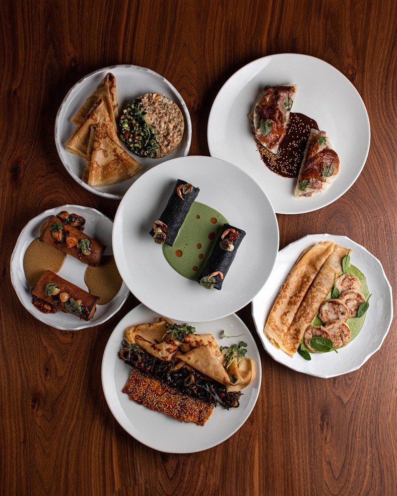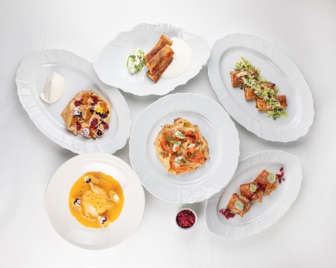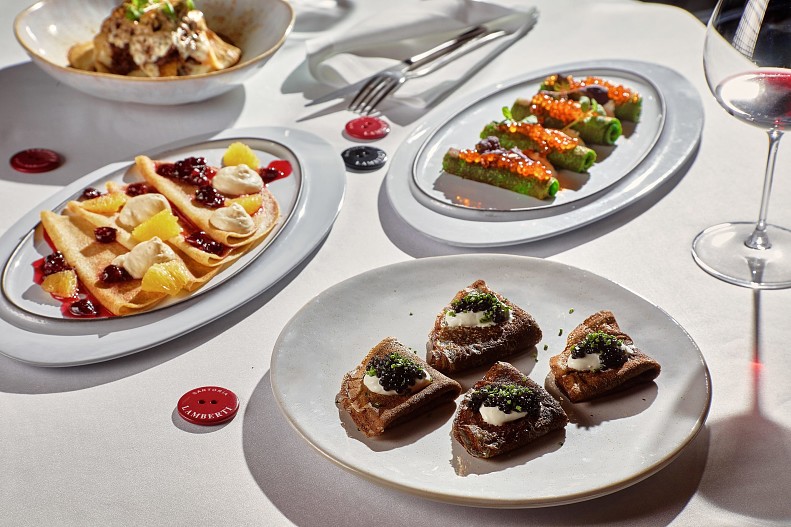 В гастрономическом ателье Sartorial Lamberti уже во всю можно дегустировать блинные рулетики из шпината с красной икрой и сметаной; блинный «торт» с лососем, сливочным сыром и муссом из артишока; кружевные блины с говяжьей щекой под соусом порто.