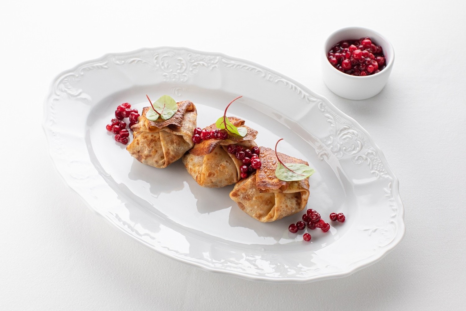 В масленичном меню пшеничные блинчики с маринованным лососем, красной икрой и кремом из сметаны и творожного сыра – одно из самых любимых праздничных сочетаний. Блинчики с тремя видами мяса шеф подает с квашеной капустой и тартаром из моченого яблока. Еще один сытный вариант – с говядиной и телячьим языком, дополнен воздушным сливочным муссом из сыра пармезан. И блинчикам с дичью, из оленины и утки, не забыли найти беспроигрышную пару, добавив моченую бруснику.