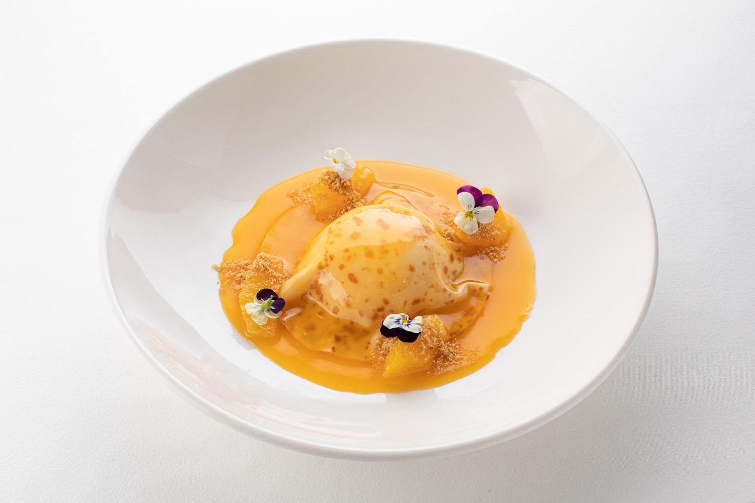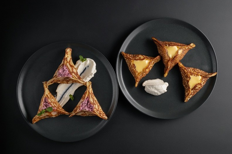 На десерт предлагаются маковые блинчиками с кремом из белого шоколада, сливочной карамелью и хрустящим арахисом или блинчики с заварным кремом и соусом из трех видов сибирских ягод: жимолости, морошки и брусники, и еще один яркий вариант – блинчики с ванильным заварным кремом и соусом на основе мякоти красного апельсина.