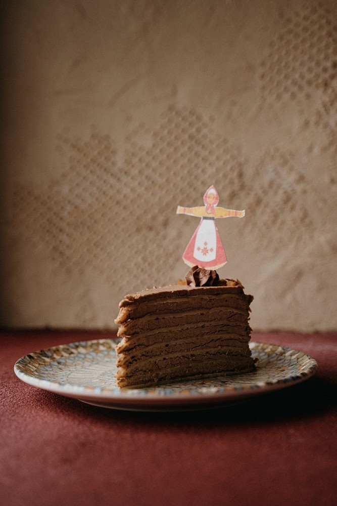На десерт предложат «Масленицу» – торт из сливочных блинов с кремом из молочного шоколада, украшенный картинкой из вафельной бумаги. При подаче официант предлагает «проводить зиму» по старой русской традиции и поджигает «фигурку», а пока она горит можно успеть снять эффектное видео.
