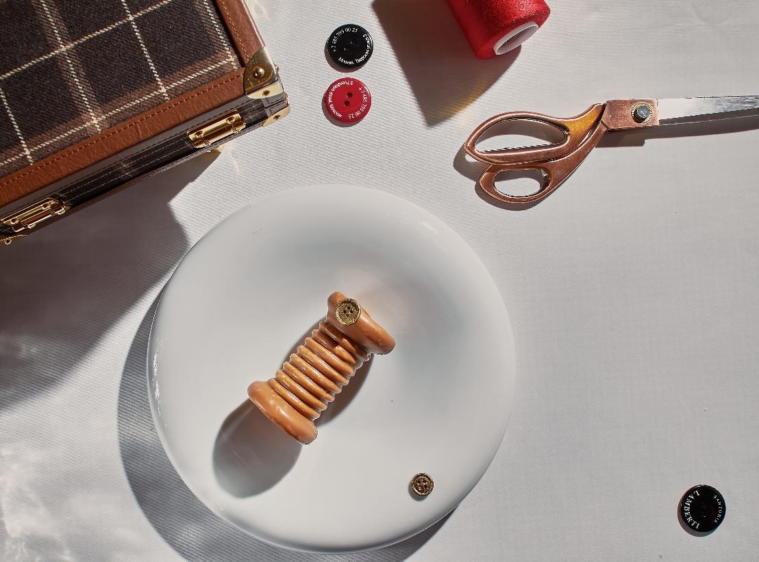 А десерта в меню целых два: блинчики с ягодным компоте, апельсином и ванильной эспумой и блинное пирожное от шеф-кондитера Наиры Соседовой. Как обычно творения Наиры призваны удивлять, на этот раз она заключила в форму катушки ниток сливочные блины и крем тирамису. композицию пуговицы из шоколада ручной работы.