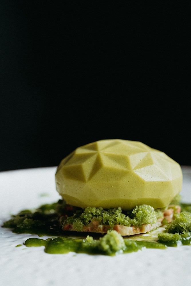 Арт-десерт от шеф-кондитера Наиры Соседовой в этом сезоне в виде брюссельской капусты: под сахарными листьями спрятан крем на основе сыра тофу и соевого молока, дополненый жасминовым чаем, а в самом центре – пюре из груши, томлёной с ванилью и апельсиновый бисквит. «Овощ» благородно возлежит на «грядке» из постных бисквитных крошек и так и завлекает скорее его попробовать.
