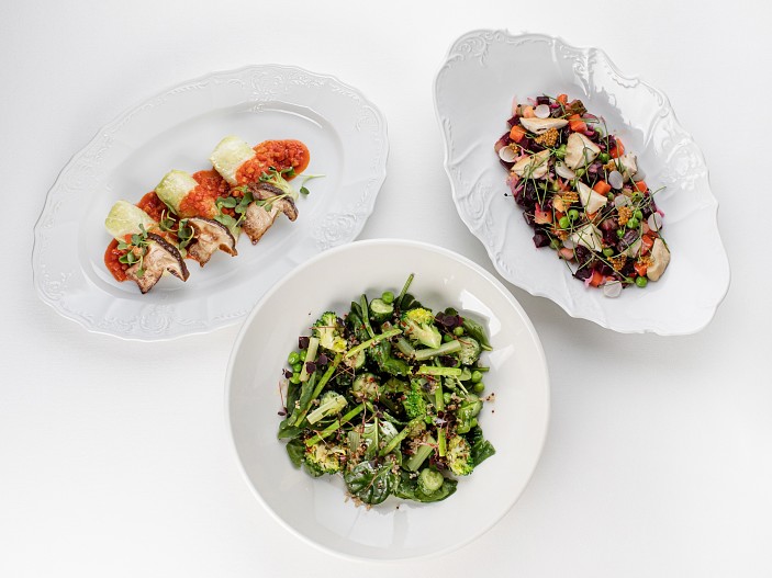 Например, постный борщ с вишней, ржаные пельмени с грибами и маслом белого трюфеля, вареники с несколькими видами ягод. На первый план выходят овощи и грибы. Вертуны из кабачков шеф сочетает с грибной икрой, овощные голубцы с белыми грибами, а салат с картофелем и щавелем – с белыми груздями. Обязательный зеленый салат Антон готовит с брокколи, спаржей, стеблем сельдерея и киноа, а салат из печеных баклажан и кабачков дополняет авокадо и вешенками.