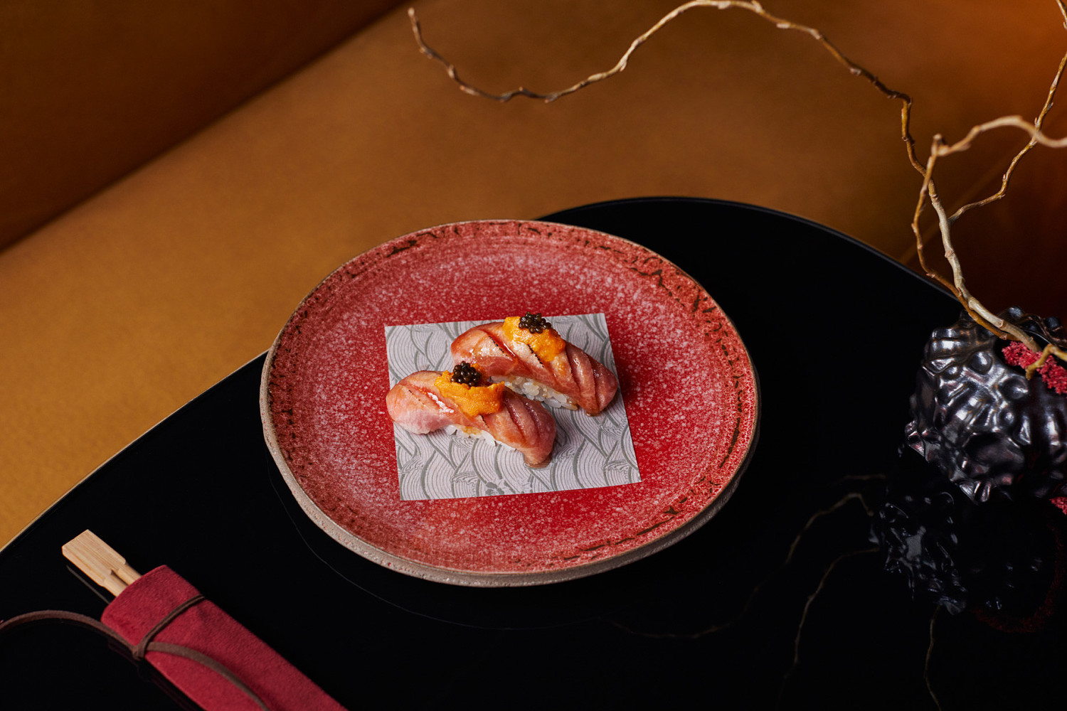 В меню присутствуют и аутентичные форматы блюд, например, японский омлет Чаван муши с шиитаке или с крабом и красной икрой или традиционные дим сам с шиитаке и вагю и вонтон с крабом и красной икрой.