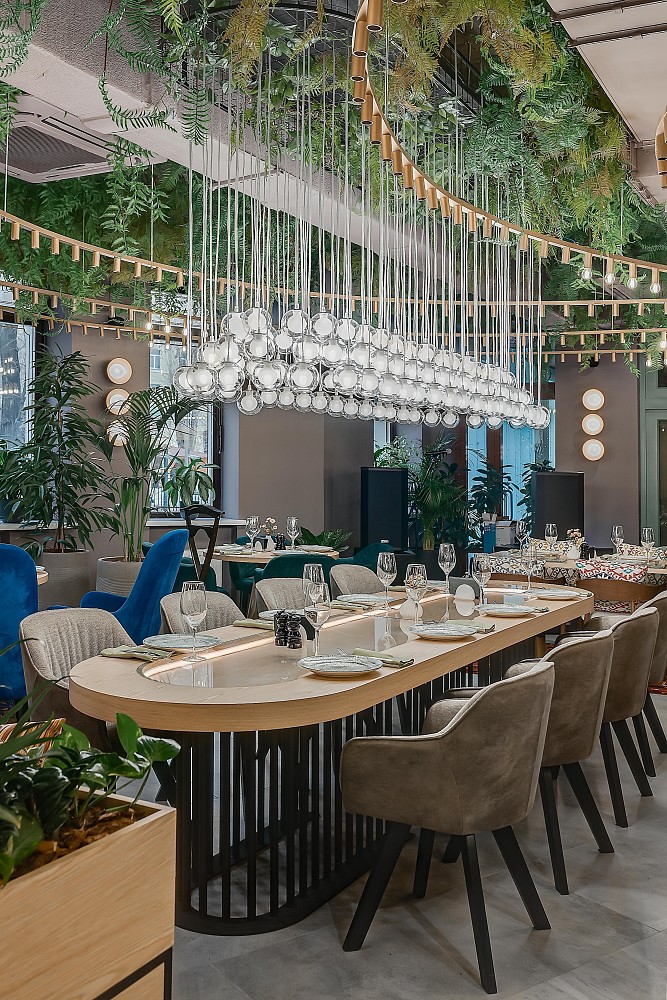 Современное нарядное пространство ресторана с обилием зелени и легкими этническими акцентами на Грузию лишь намекает. Светлое дерево, бетон, теплые золотистые шары светильников, пестрые дагестанские ковры-сумахи создают приподнятую атмосферу. Растущая в центре огромного стола олива и масштабный винный стеллаж украшают отдельную комнату, где могут собираться компании до 12 человек.