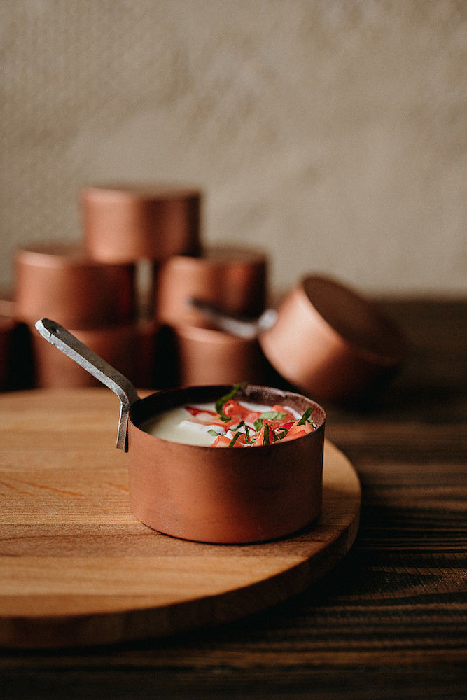 Каждый десерт – это отдельный гастрономический сюжет: вот клубок пряжи, а внутри чизкейк с карамелизированным белым шоколадом и томленой грушей на бисквите дакуаз. Вдохновением для кондитера послужили истории Уиллиама Ламберти о любимой бабушке Франческе, вязавшей ему шарфы. Вот концептуальная версия панна-котты – «Вареные сливки» с тартаром из клубники, маринованной в апельсиновом соке с мятой подаются в съедобном сотейнике ручной работы из темного бельгийского шоколада.