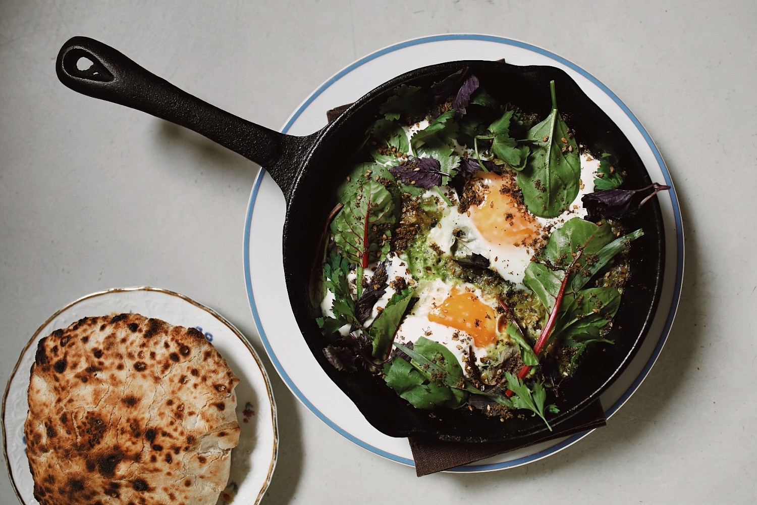 В меню вошли: зеленая шакшука с миксом зелени, зеленым перцем, запеченным на углях, луком-пореем и солеными лаймами, страчателлой и заатаром. оладьи из цукини на подушке из легкого йогурта, рубленой мяты, цедры лимона.
