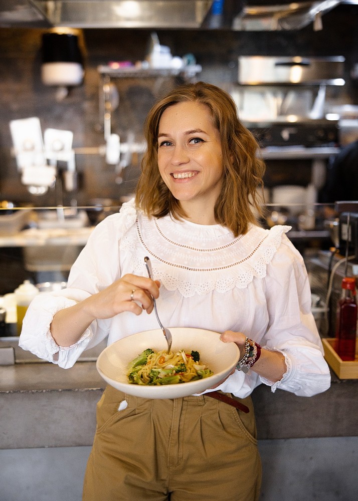 Таня Перепёлкина – PR-специалист, преподаватель Moscow Food Academy, автор телеграм-канала Food Studies. Таня придумала сливочную пасту с брокколи и перцем. Нежную, бодрящую и быструю, что соответствует современному образу жизни. «В моей пасте яркие контрастные цвета: белый, зелёный и красный, а также насыщенный сливочный вкус и аромат свежего перца. Хороший баланс во вкусе – наше все», – считает Таня.