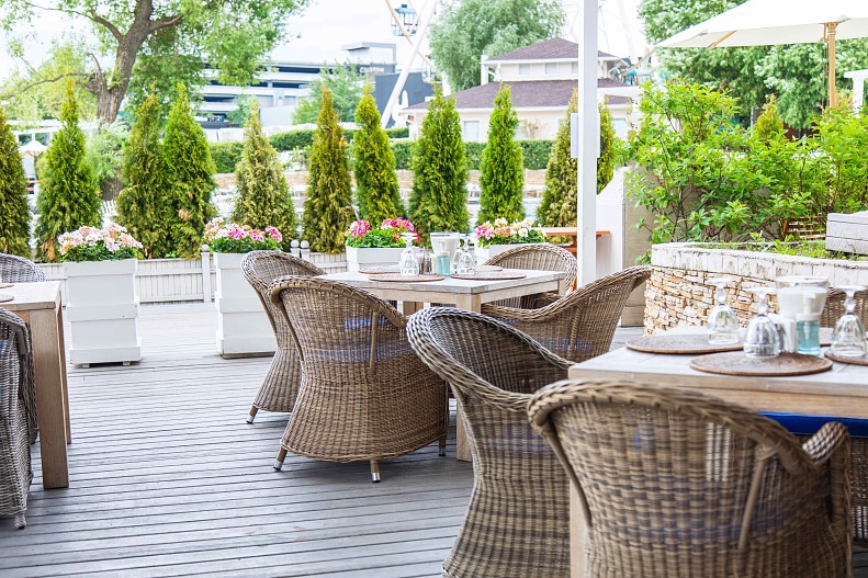 С приходом теплых дней здесь можно уютно расположиться на веранде, чтобы насладиться освежающим коктейлем, мечтательно созерцая причаливающие к пирсу яхты, или отменным меню, в котором представлены блюда азербайджанской, узбекской, европейской и японской кухонь. Выбор холодных супов, свежих салатов, кутабов, обжигающих шашлыков, кебабов или стейков неприлично велик.