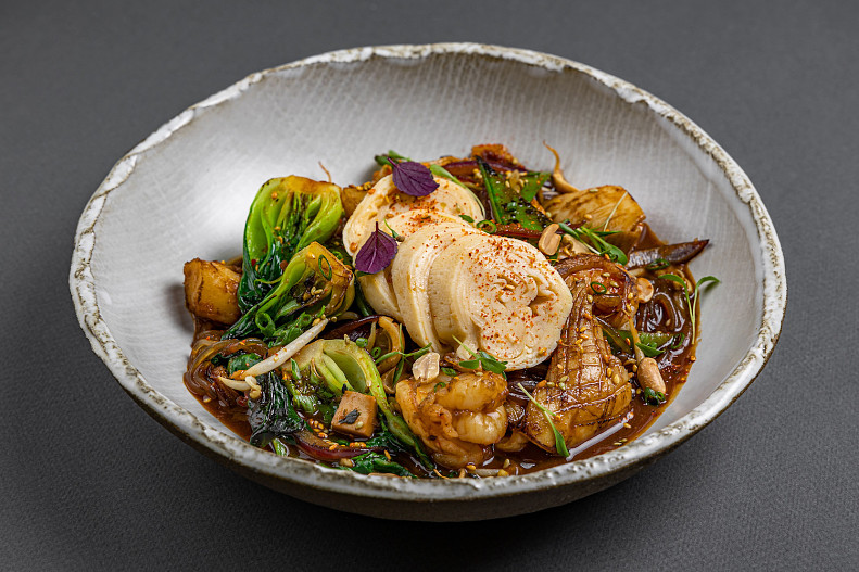 Меню пестрит всем самым славным, за что мы любим Азию. Рекомендуется пойти с козырей, и выбрать, например, заглавное блюдо любого паназиатского ресторана – Пад Тай с морепродуктами, который в прочтении Twin Tigers готовится с бататной лапшой и усилен рулетом из омлета. Или хитовые бао с рваной уткой и манго, тесто для которых готовит непалец по известному ему одному в этом городе рецепту. Зеленый салат с помело и кунжутным соусом такой простой и гениальный одновременно, что вам точно захочется попробовать приготовить его у себя дома. А ради пельменей с креветками вы будете возвращаться в Twin Tigers снова и снова, поскольку сочетание мангового пюре с рубленым мясом креветки «нельзя просто взять и забыть». Как, собственно, и холодные tigers tea – манго/жасмин/зеленый чай или матча/кокос, в которые добавляется диковинная тапиока, представляющая собой маленькие сладковатые съедобные шарики, получаемые из корней тропических растений.