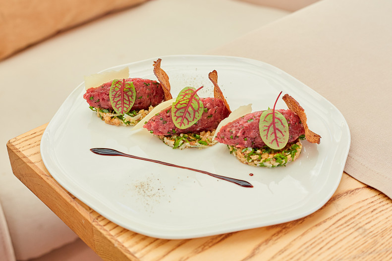 Или насладиться нежнейшими карпаччо — из красного тунца с соусом «Юдзу» и свежими овощами, из осьминога «по-лигурийски» с кенийской фасолью или из артишоков с рукколой и пармезаном: последнее — отличный веганский вариант. А тартар из мраморной говядины с белыми грибами и черным трюфелем запомнится не только нежностью идеально нарезанного мяса, но и ярким ароматом грибов.