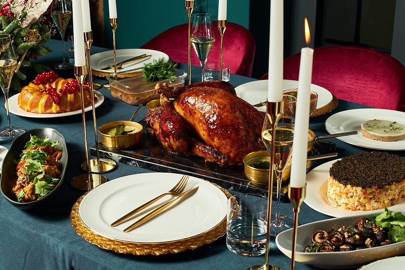 Мясной ресторан 800°С Contemporary Steak предлагает заказать два варианта новогодних сетов ⎯ наполнение можно выбрать по собственному желанию. Под бокал шампанского подойдет роскошный оливье с лососем и черной икрой или авторская сельдь под шубой: после дегустации у вас появится новый взгляд на этот классический новогодний салат. Но если вы захотите по-настоящему удивить гостей, выбирайте салат Black Angus с вешенками и кенийской фасолью, мясной пломбир, риет и блюда с фуа-гра: паштет “Черри” и пирог Pate en croute. А на горячее ⎯ сочную индейку в глазури из белого персика или запеченное мясо Black Angus, Новогодний стол также украсят шиитаки с орехами, острые баклажаны, черри с кунжутом, ассорти фирменного пюре, мандариновый кекс с орехами, и это далеко не всё меню!
