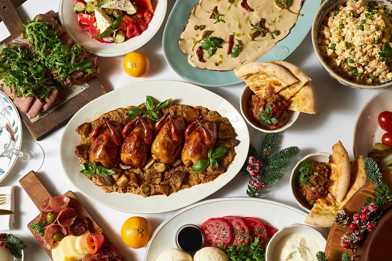 В «Сыроварне» в Парке Горького новогоднее настроение чувствуется едва ли не первым в городе. Здесь уже можно заказать любой их трех сетов на компанию: рыбный с сибасом а-ля Аква Пацца с вонголе в качестве главного блюда, мясной с томленой лопаткой ягненка и классический ⎯ с фаршированными перепелками на киноа с грибами. Во все сеты входят фирменные сыры собственного производства из фермерского молока ⎯ буррата, моцарелла, скаморца, страчателла, которыми по праву славится «Сыроварня». Равнодушными не оставят и другие блюда сета ⎯ фирменный оливье с мортаделлой, различные закуски и соленья, шоколадный торт с манго и бананом и многие другие.
