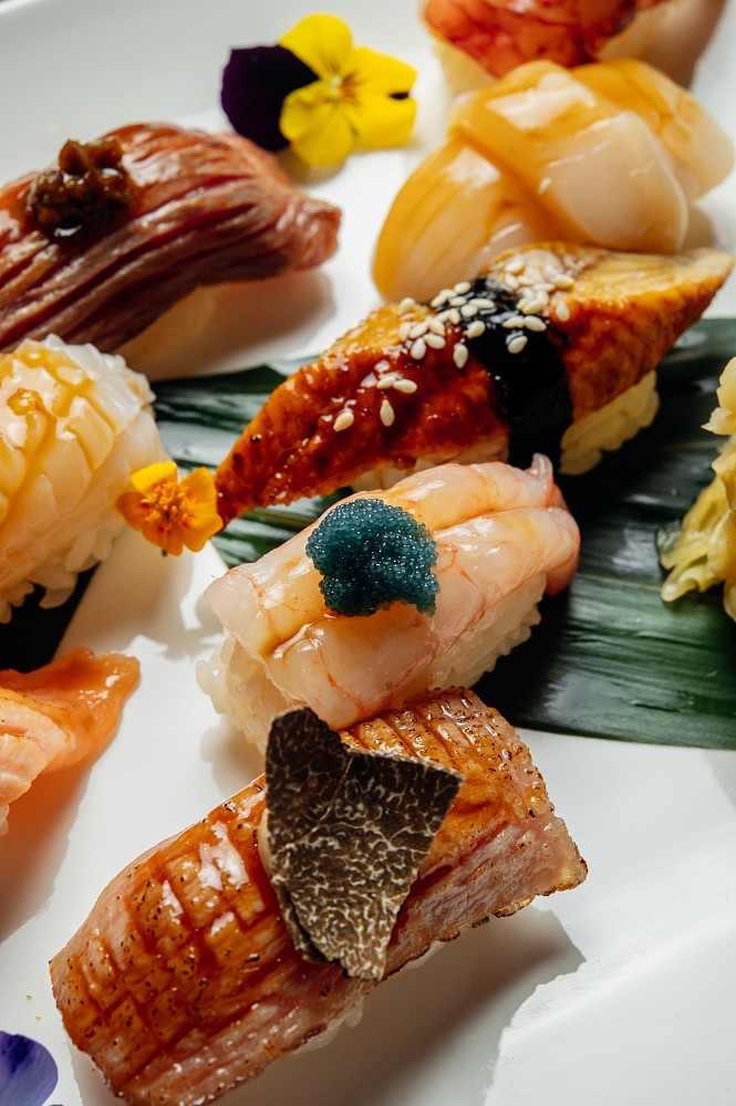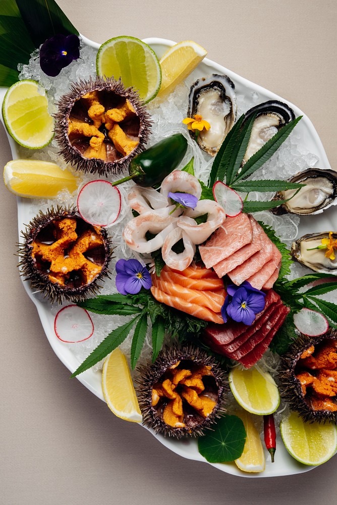 В меню представлены японские устрицы, свежайшие сашими и суши, например, из трубача с халапеньо или из тунца аками с трюфелем, а также крудо из сибаса, дорадо или пагра с юдзу и чили/ в токийском стиле. Среди роллов – как классика, так и авторские вариации, например, корейский кимпаб с крабом или кимчи ролл.