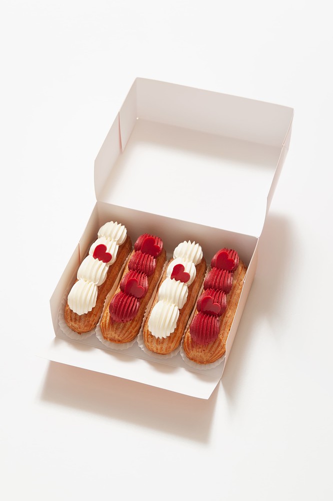 - набор эклеров ЛЮБОВЬ (4 шт), эклеры с ванильным и малиновым заварным кремом украшены шоколадным ганашем и красными шоколадными сердцами