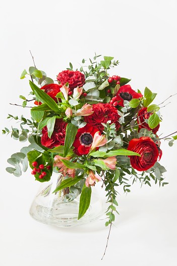 - букет ЛЮБОВЬ, с красными розами, анемонами, ранункулюсами, тюльпанами и красными ягодами