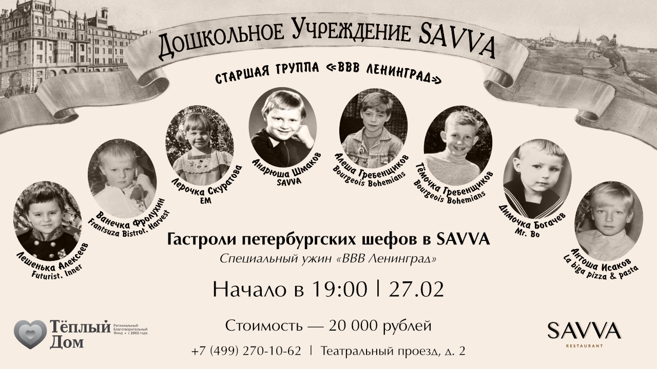 Мишленовский ресторан SAVVA находится в исторической гостинице «Метрополь» и носит имя экстравагантного мецената, коллекционера и филантропа Саввы Мамонтова, что неслучайно определяет творческий характер проекта с тягой к путешествиям. Очередное приключение состоится 27 февраля. Шеф-повар SAVVA Андрей Шмаков задумал собрать на одной кухне 7 своих хороших друзей, а, по совместительству, выдающихся шеф-поваров Санкт-Петербурга. На гастроли под кодовым названием «ВВВ Ленинград» прибудут Артем и Алексей Гребенщиковы (Bourgeois Bohemians), Иван Фролухин (Frantsuza Bistrot, Harvest), Дмитрий Богачев (Mr. Bo), Антон Исаков (La biga pizza & pasta), Алексей Алексеев (Futurist, Inner) и Валерия Скуратова (ЕМ). Каждый из гостей приготовит особое блюдо, вдохновленное ретро-эстетикой Петербурга времен СССР и приятнейшей поры — собственного детства. Даже афиша мероприятия будет стилизована под советские фотоальбомы начальной школы: умиляться детским личикам теперь уже широко известных взрослых — то еще удовольствие. Андрей Шмаков тоже приготовит свою «историю». Все подачи будут сопровождаться персональным сторителлингом от авторов блюд. Шефы выйдут в зал и будут общаться с гостями в неформальной обстановке: расскажут концептуальную идею рецептов и ответят на любые вопросы без лишних условностей.