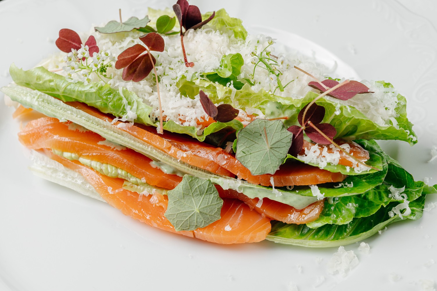 Мильфей романо с лососем и соусом из зелени Мильфей романо с лососем и соусом из зелени