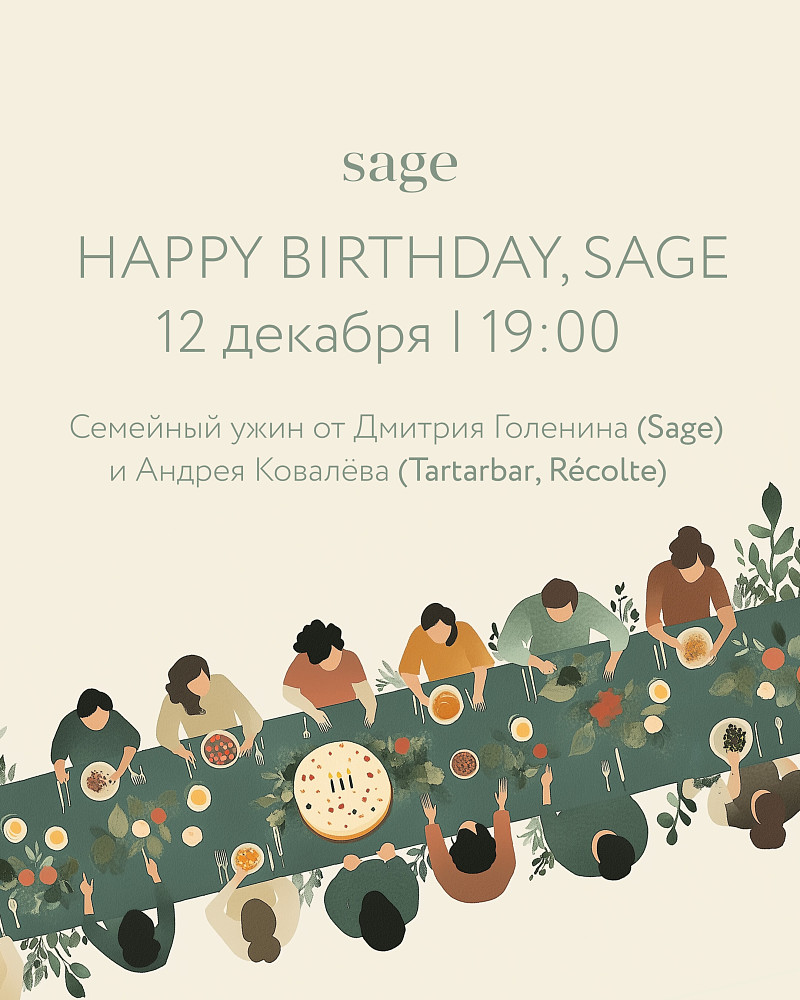 12 декабря ресторан Sage Дмитрия Блинова и Владимира Перельмана во главе с шеф-поваром Дмитрием Голениным отмечает третий день рождения. Готовить будут Дмитрий Голенин и питерский шеф-гость Андрей Ковалев из Tartarbar и Recolte. Ужин пройдет в уютном формате friends & family: вместо упорядоченных подач в сет-меню войдут объемные и разнообразные блюда на компанию, как это принято на семейных торжествах и теплых вечеринках для самых близких.