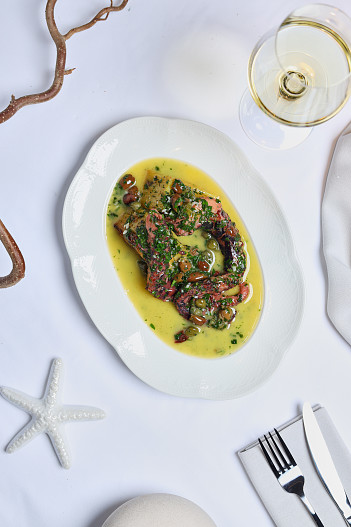 В меню ресторана широкий ассортимент горячих блюд, салатов, закусок. Свежие морепродукты — устрицы, морские ежи, гребешки, раки, крабы. И, разумеется, великолепные десерты.