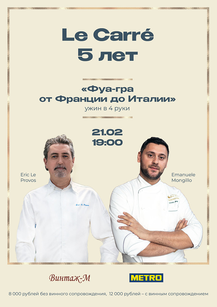 21 февраля в честь юбилея ресторана прославленный шеф и владелец Le Carré Эрик Ле Прово приглашает гостей на уникальный ужин в четыре руки вместе с Эмануэле Монджилло – шефом легендарного итальянского ресторана Balzi Rossi. За основу меню шефы взяли один из самых узнаваемых продуктов Франции – фуа-гра, мастерски обыграв его в гастрономических традициях двух стран.