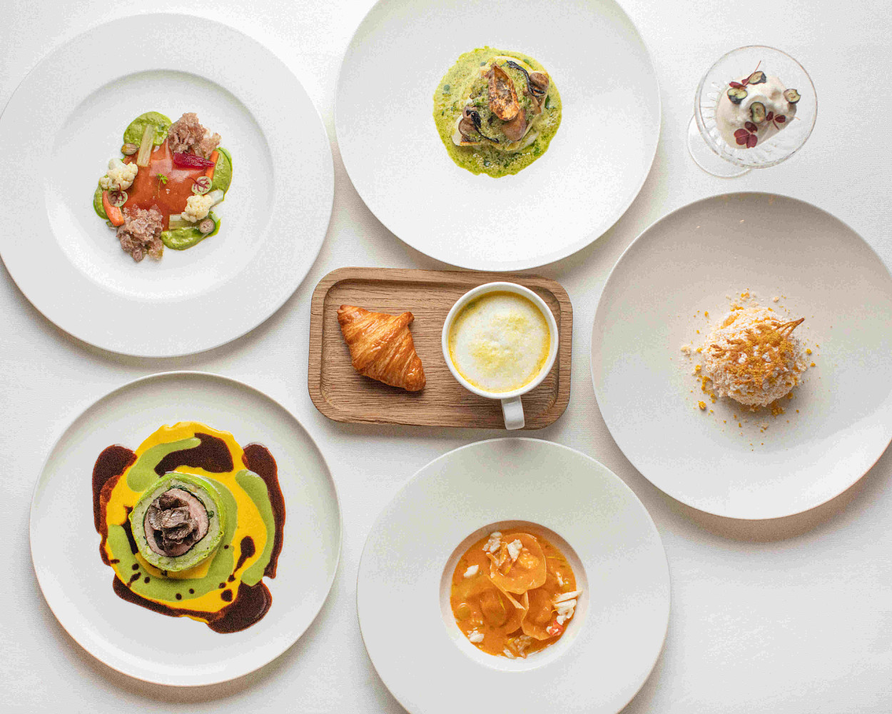 Открывает сет джардиньера — закуска, которую шеф готовит из нежных говяжьих щечек и подаёт с соусом сальса верде из петрушки и анчоусов и пикантным томатным соусом. «Капучино» из лосося украшают молочной пеной и сочетают с хрустящим круассаном с начинкой из копченого лосося, а жареного муксуна укладывают на подушку из пюре из топинамбура, оттеняют грибным рагу и украшают чипсами из топинамбура. Тортелли с крабом и апельсиновой цедрой Мирко комбинирует с пюре из желтой моркови под крабово-апельсиновым соусом, сверху — невесомые цветочные лепестки.