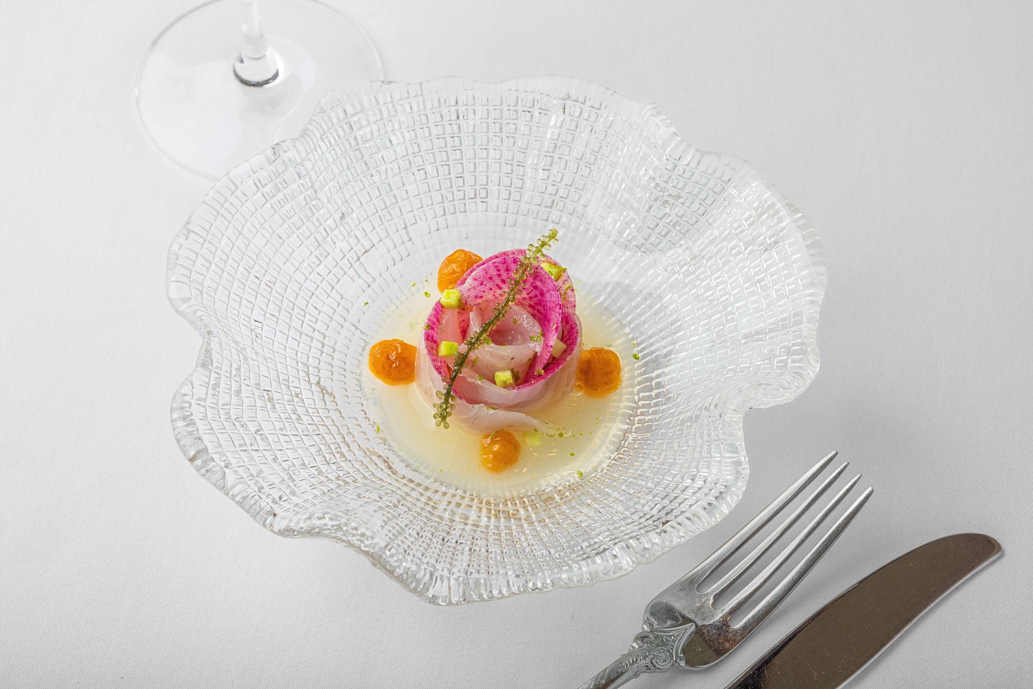 Возможно, кто-то впервые попробует рифовую рыбу цезий – настоящий деликатес с сочным и насыщенным вкусом, напоминающим белого тунца. Настолько нежный, что его надо есть сырым, оттеняя сочностью арбузного редиса, соусом из морошки и морским виноградом.