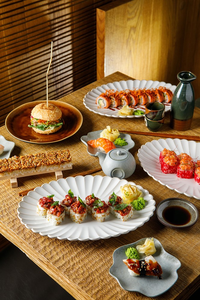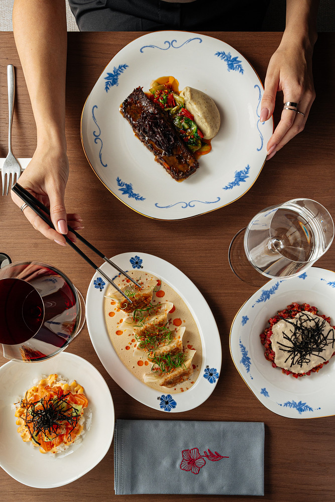 Меню собрано как карта путешествия: лангустины в хрустящем катаифи, тартар из говядины с маринованными шиитаке, тайский том ям и роллы, в которых угорь встречается с апельсином и миндалём. Коктейли выстроены в веер — «Сегун» с жасминовым чаем, «Поцелуй Чон Сок» с земляничным ликёром, твист на негрони «Бархатный император». Десерты Ксении Соловьёвой — монблан с юдзу и шисо или пудинг с рисовым молоком — соединяют французскую технику с восточным колоритом.
